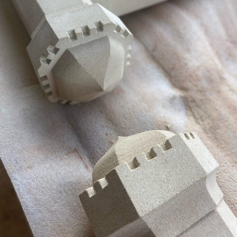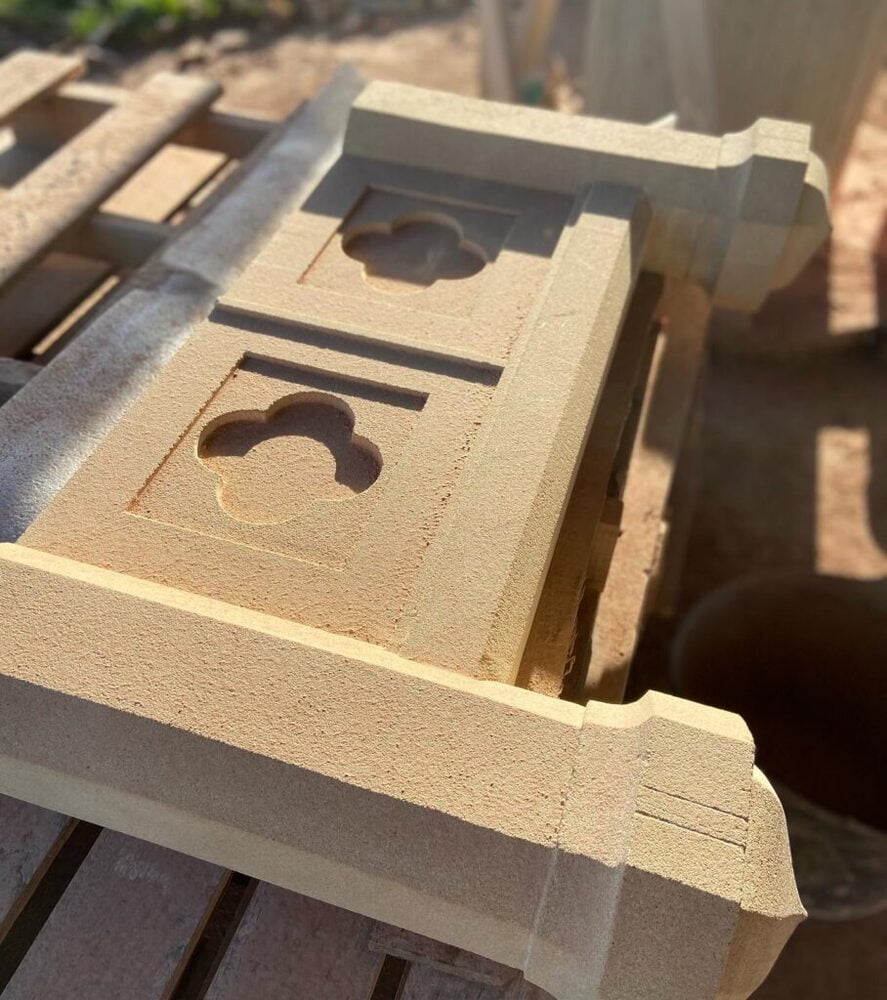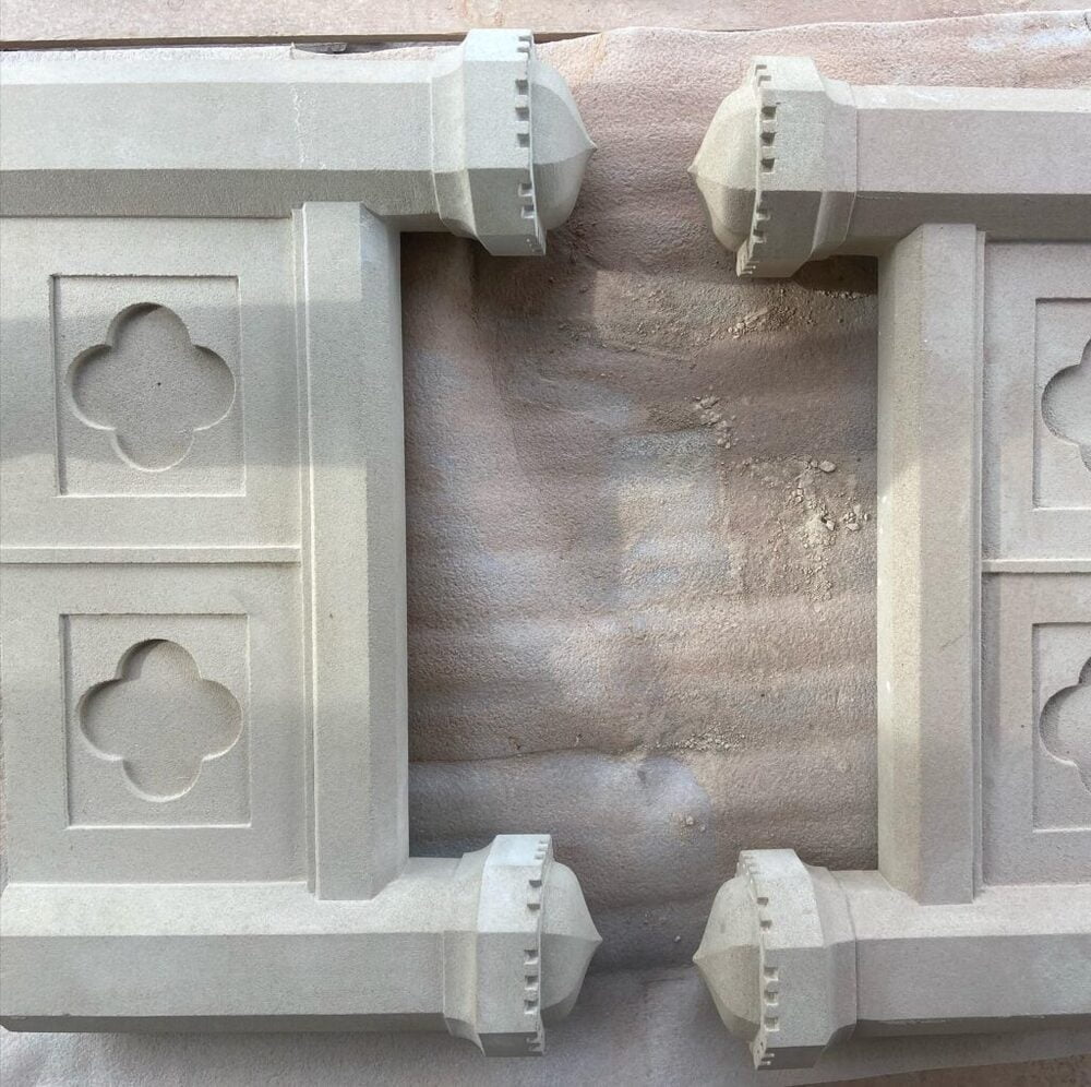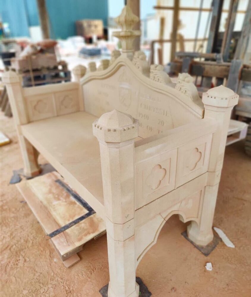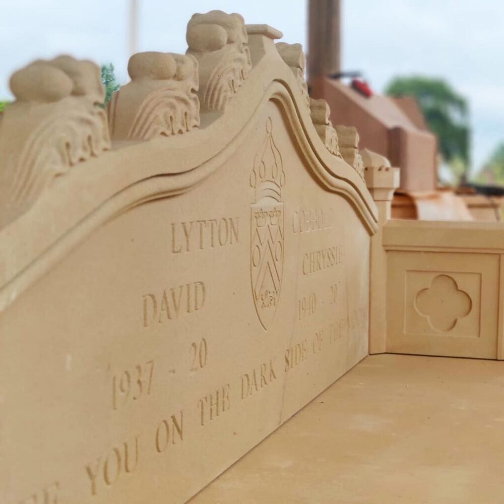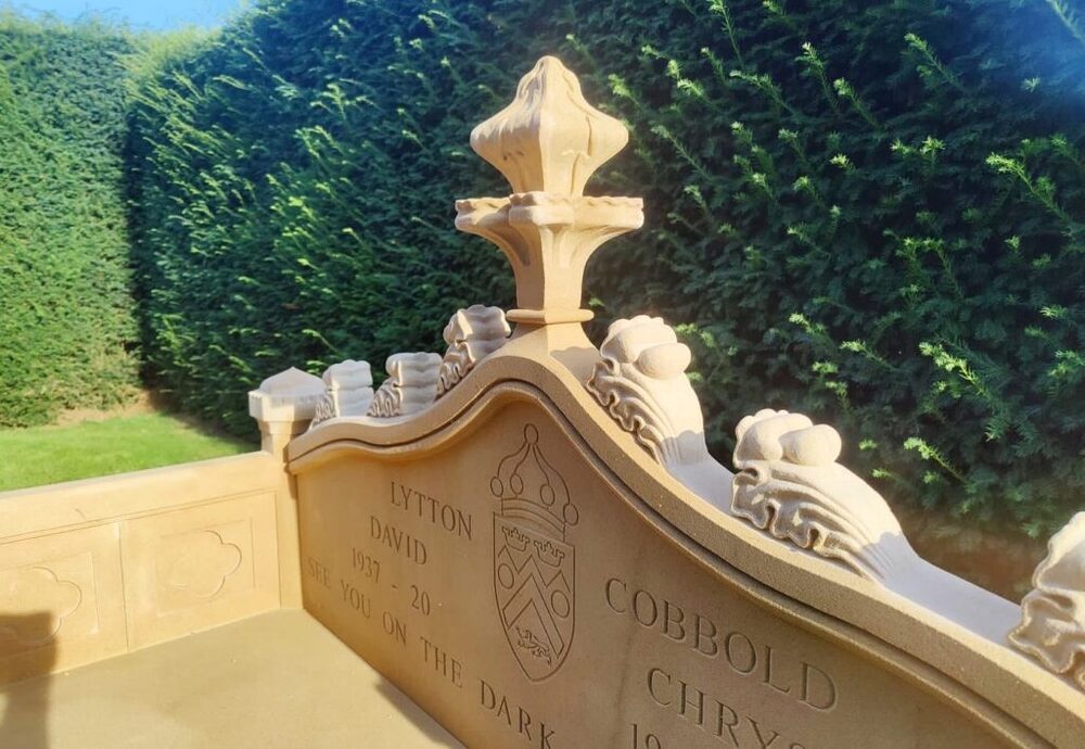 Knebworth in the parish of Knebworth in Hertfordshire, England. It is a Grade I* listed building! Its surrounding park is the medieval St. Mary’s Church and the Lytton family mausoleum. On behalf of Lord and Lady Lytton Cobbold we were commissioned to design and mason a memorial bench in the high gothic revival style reflecting the house behind.