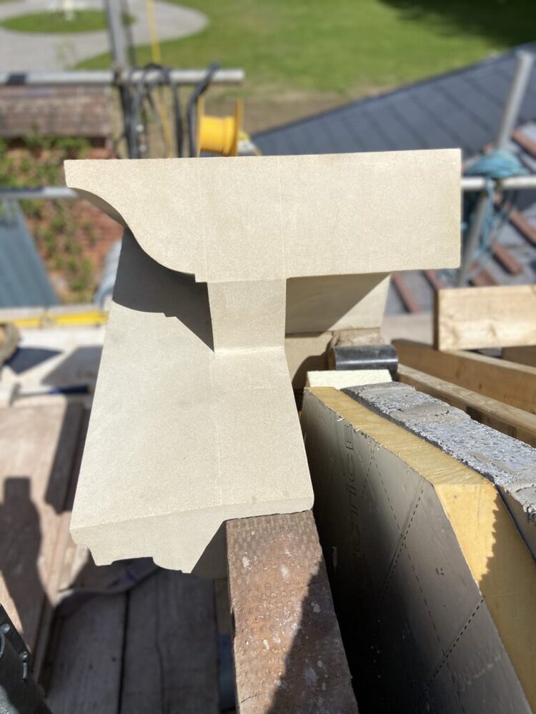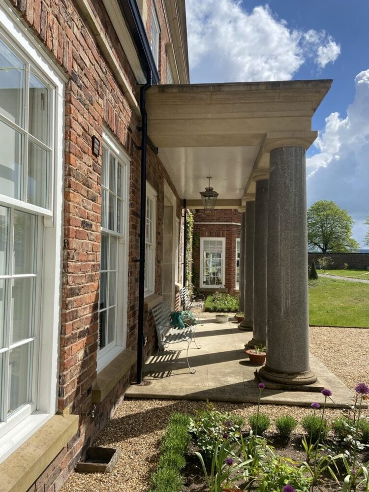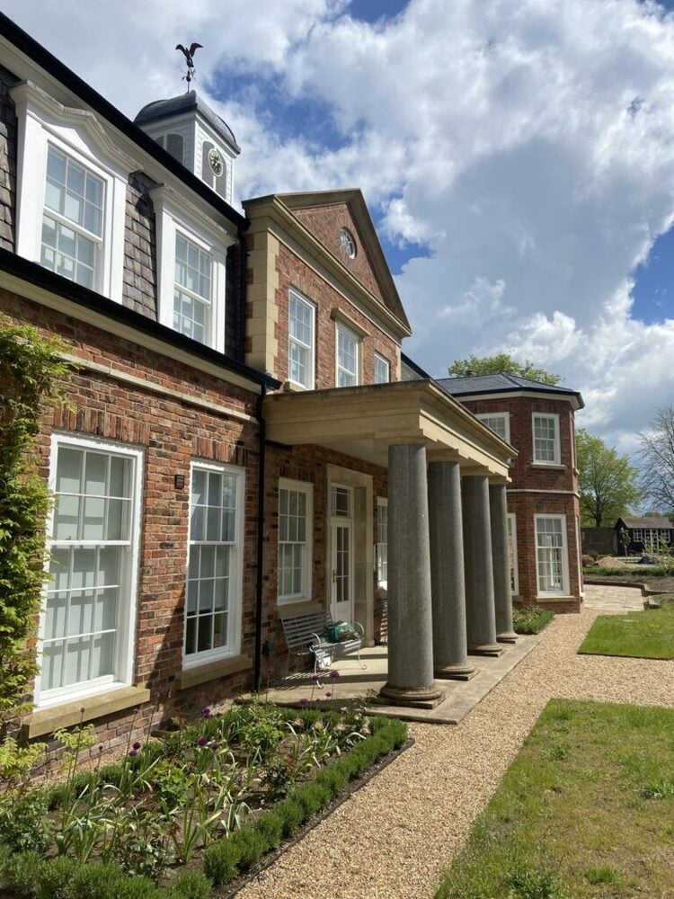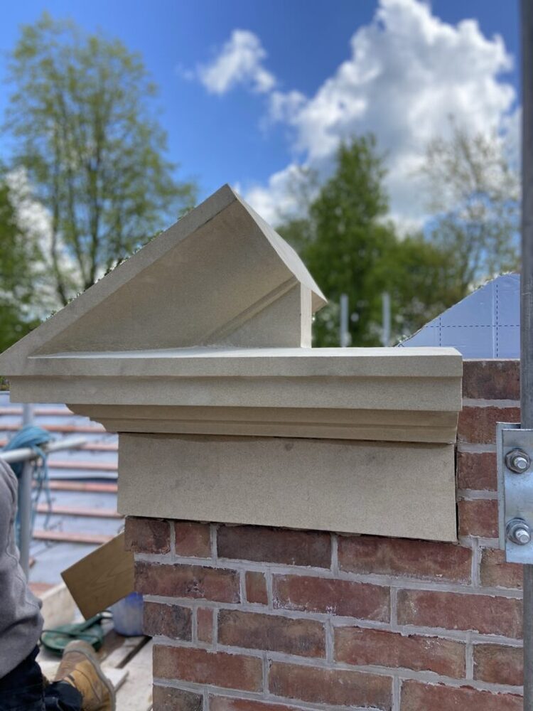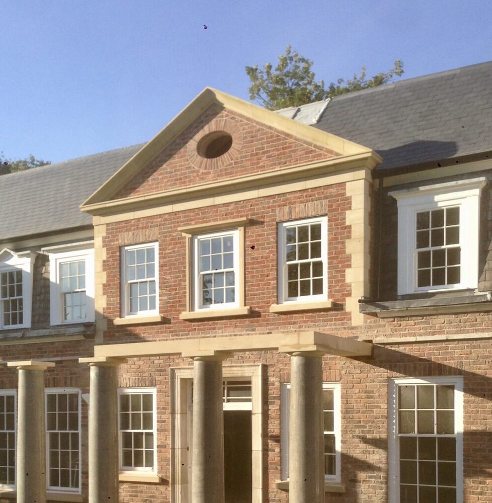 McMilllan & Holder were invited to supply all of the architectural stone elements on this period development. The supply of buff sandstone components kept pace with the needs of the principle builder. Corner quoins, threshold stones, flat bands, window heads and a significant cornice, springers and pediment. A large Doric portico was supplied and installed by McMillan & Holder. 2 tonne blue granite columns with sandstone column bases, capitals and entablature.