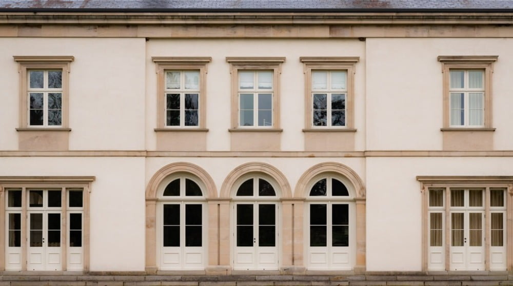 A new hall has since emerged combining the best of Georgian and Victorian styles. The building is complete with plinth course, portico entrances and door architrave surrounds, Ionic columns, window surrounds and string course, crowned with an elegant and substantial cornice and parapet blocking course.